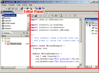 The picture above shows the JControl/IDE's menu and icon bars highlighted by a red frame. The menus and icons located here cover the basic functionality of the development environment. This includes the creation of new projects, the alteration of project settings, as well as the configuration of the serial port used for transferring data between the PC and the JControl device. The content of the menu bar may vary, depending on the current state of the IDE. For example, the opening of the JAVA™ source code editor adds a new menu labeled File.