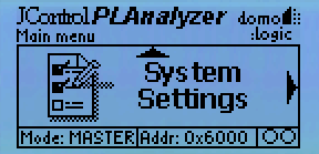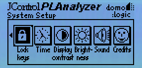 Die in diesem Tutorial vorgestellte grafische Benutzeroberfläche besteht prinzipiell aus zwei Hierarchieebenen: Dem Hauptmenü sowie mehreren einzelnen Untermenüs. Da das Hauptmenü in der Regel nur wenige Menüpunkte enthält, spricht nichts dagegen, diese einzeln und bildschirmfüllend darzustellen. Auf diese Weise steht mehr Fläche für die Gestaltung der Menüpunkte zur Verfügung und die jeweilige Funktion läßt sich leichter auf einen Blick erkennen - was vor allem aus ergonomischer Sicht ein Vorteil ist. Bild 1 zeigt den Entwurf eines Hauptmenüs, das für die Bedienung mit einer Joystick-Tastatur entworfen wurde. Es handelt sich übrigens dabei um die grafische Benutzeroberfläche für ein Gerät zur Analyse der Übertragungseigenschaften von Signalen, die über das ganz normale Stromversorgungsnetz versendet werden (JControl/PLUI, ein sog. Power-Line-Analyzer) - aber das sei nur am Rande bemerkt.