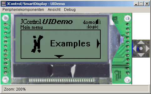 Testen der UIDemoZum Testen der UIDemo: Laden Sie die Datei UIDemo.zip herunter und entpacken Sie das ZIP-Archiv in ein leeres Verzeichnis. Es enthält alle in diesem Tutorial vorgestellten Dateien, sowie eine JControl/IDE-Projektdatei . Öffnen Sie die Projektdatei mit der JControl/IDE und klicken Sie auf den Simulations-Button. Daraufhin öffnet sich der JControl-Simulator mit der Darstellung des ausgewählten JControl-Moduls und des grafischen Benutzermenüs (ähnlich wie in Bild 3).