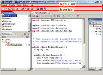 The picture above shows the JControl/IDE's menu and icon bars highlighted by a red frame. The menus and icons located here cover the basic functionality of the development environment. This includes the creation of new projects, the alteration of project settings, as well as the configuration of the serial port used for transferring data between the PC and the JControl device. The content of the menu bar may vary, depending on the current state of the IDE. For example, the opening of the JAVA™ source code editor adds a new menu labeled File.