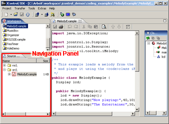 Most projects consist of not just a single, but a number of files. A project can contain JAVA™ source code files, images, fonts, melodies or any application specific files. All files of a project are listed in the navigation panel. If only source files (and no class files, for instance) are displayed here, Source navigator is used as an equivalent term for navigation panel.