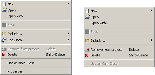 - Save: Saves the selected file. This item is only available if the the selected file is opened and modified by an editor. This menu item corresponds to the save-function of the editor.