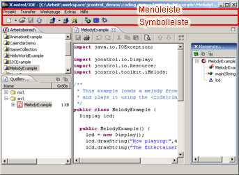 Im obigen Bild sind die Menüleiste (oberer Bereich) sowie die Symbolleiste (unterer Bereich) der JControl/IDE rot eingerahmt. Diese stellen mit ihren diversen Menüpunkten den grundlegenden Funktionsumfang der Entwicklungsumgebung dar. Dazu gehört beispielsweise das Anlegen und Speichern von Projekten, das Verändern der Projekt-Eigenschaften sowie Verbindungseinstellungen für die serielle Schnittstelle. Die Anzahl der Einträge in der Menüleiste kann je nach Kontext variieren: Beispielsweise fügt der Java-Quelltexteditor den Menüpunkt Datei in die Menüzeile mit ein.