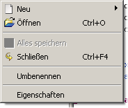 Mit der Funktion Umbenennen läßt sich dem aktiven Projekt ein anderer Name zuordnen. Die Projekt-Datei wird ebenfalls umbenannt, sofern der alte Projektname dem Dateinamen entsprach. Ein Projekt kann ebenfalls umbenannt werden, indem auf den Namen des Projektes geklickt wird. Alle anderen Punkte in diesem Kontext-Menü entsprechen den Punkten im Menü Projekt und wurden im vorigen Abschnitt bereits erläutert. |