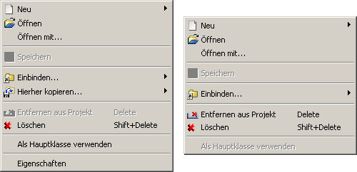 Bild 8: Das Kontext-Menü des Quellen-Navigators (links) und des Klassen-Navigators (rechts)