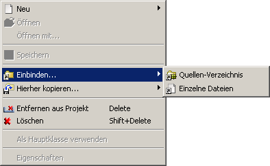 Dateien und Verzeichnisse einbindenAb IDE Version 3.3.0 können einem Projekt komplette Verzeichnisse als Quellen zugewiesen werden. D.h. der gesamte Inhalt eines Verzeichnisses wird automatisch als Teil des Projektes betrachtet. Die IDE behandelt hierbei jedoch nur solche Dateien, die mit dem jeweiligen JControl-Gerät kompatibel sind, bzw. vom Kompiler in ein entsprechendes Format konvertiert werden können. In aller Regel werden das genau jene Dateiformate sein, die auch von der IDE selbst erstellt werden können. (vgl. Neue Dateien erstellen). Das bedeutet, daß eventuell vorhandene Meta-Dateien (CVS- oder SVN-Einträge, Thumbnails, INI-Dateien etc.) ignoriert und nicht versehentlich mit auf das Gerät geladen werden. Wird der Inhalt der Quell-Verzeichnisse von externen Programmen in irgendeiner Form geändert, so registriert die IDE dies und aktualisiert das Projekt automatisch. Wie in frühreren Versionen ist es auch nach wie vor möglich, nur einzelne Dateien, die nicht innerhalb eines Quellen-Verzeichnisses liegen, einzubinden. Wie das Erstellen neuer Dateien auch erfolgt das Einbinden von Verzeichnissen oder einzelner Dateien über das Kontextmenü des Navigations-Fensters.