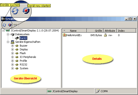 - Werkzeugleiste Hier befinden sich die Werkzeuge Geräte suchen und Gerät neu starten. Der dritte Punkt Geräte aufrufen ist z.Z. noch nicht implementiert.