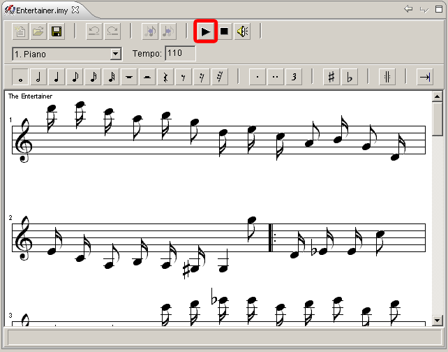 Der Melodie-Editor zeigt die Noten des bekannten Ragtimes "The Entertainer" von Scott Joplin (siehe Bild 1). Drücken Sie auf den Play-Button (in Bild 1 rot umrahmt), um den Song über Ihre Soundkarte abzuspielen.